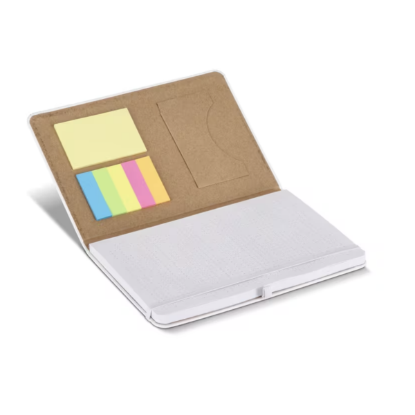 Het notitieboek is bedrukbaar met jouw logo en bevat 96 vellen waarbij de voorzijde is voorzien van een puntraster en de achterzijde gelinieerd is. Inclusief 25 grote en 25 kleine sticky notes in vijf verschillende kleuren voor overzichtelijke notities.