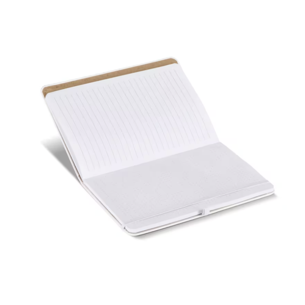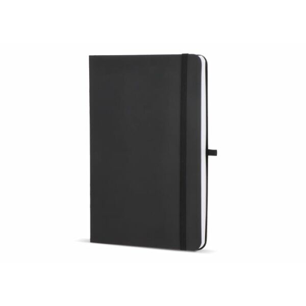 De pagina’s zijn vervaardigd uit 100% gerecycled papier en worden beschermd door een stevige PU hardcover met elastische sluiting en penlus. Het geïntegreerde binnenvak biedt ruimte voor visitekaartjes, waardoor dit een duurzaam en functioneel relatiegeschenk is.