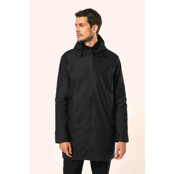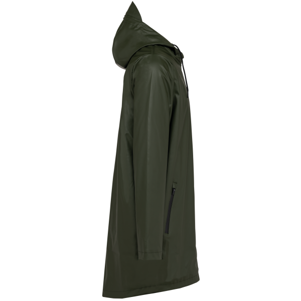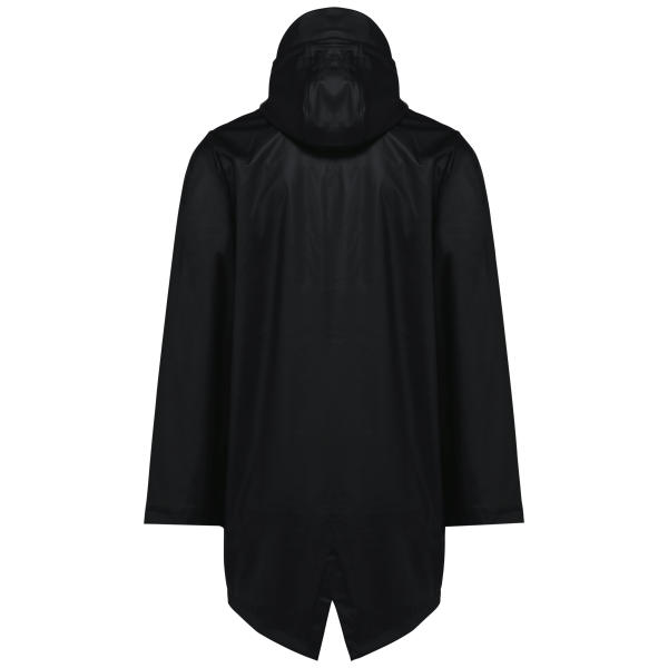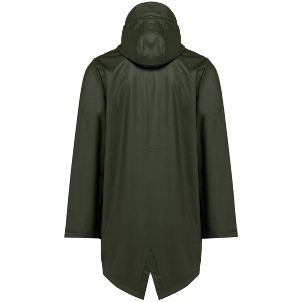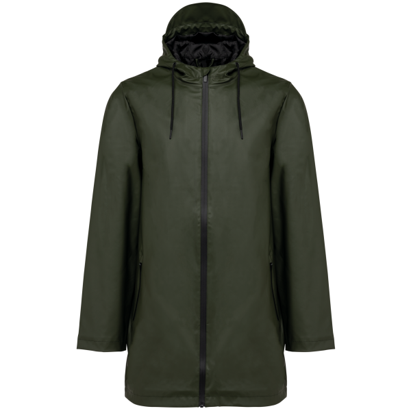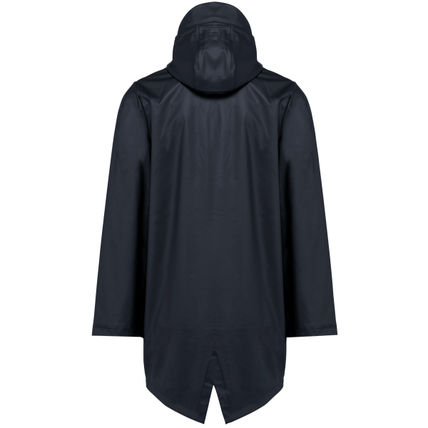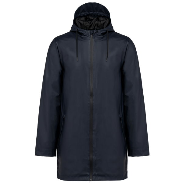 Buitenste laag in 100% polyurethaancoating en binnenste laag in 100% polyester. Thermogelaste naden. Waterdicht 5000 mm. Voering 100% polyester. Capuchon met zonneklep en aanrijgkoordjes met metalen stopper. Ritssluiting tot aan de capuchon met verborgen trekker. 2 zijzakken met waterdichte ritssluiting en verborgen trekker. Verluchtingsgaatjes aan de oksels. Langer achterpand met een ruimtesplit onderaan. Lus aan de binnenkant van de kraag om het jasje te kunnen ophangen. Personaliseerbare patch bovenaan de rug aan de binnenkant. Een drukkersrits aan de binnenkant, op de achterkant onderaan en op de hartkant. Geen merklabel, maar enkel een maatlabel voor eenvoudige personalisatie.