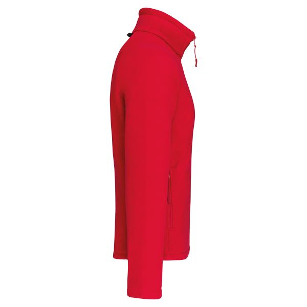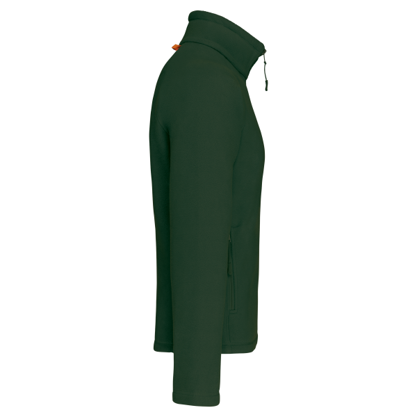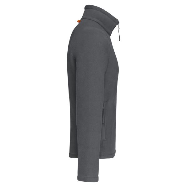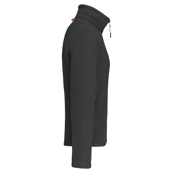 100% polyester microfleece met anti-pilling behandeling. Raglan mouwen. Ritssluiting. 2 voorzakken met rits. 2 binnenzakken. Aanrijgkoord. Afwerkingsbiesjes aan de binnenzakken en bandje rond de hals in contrastkleur.